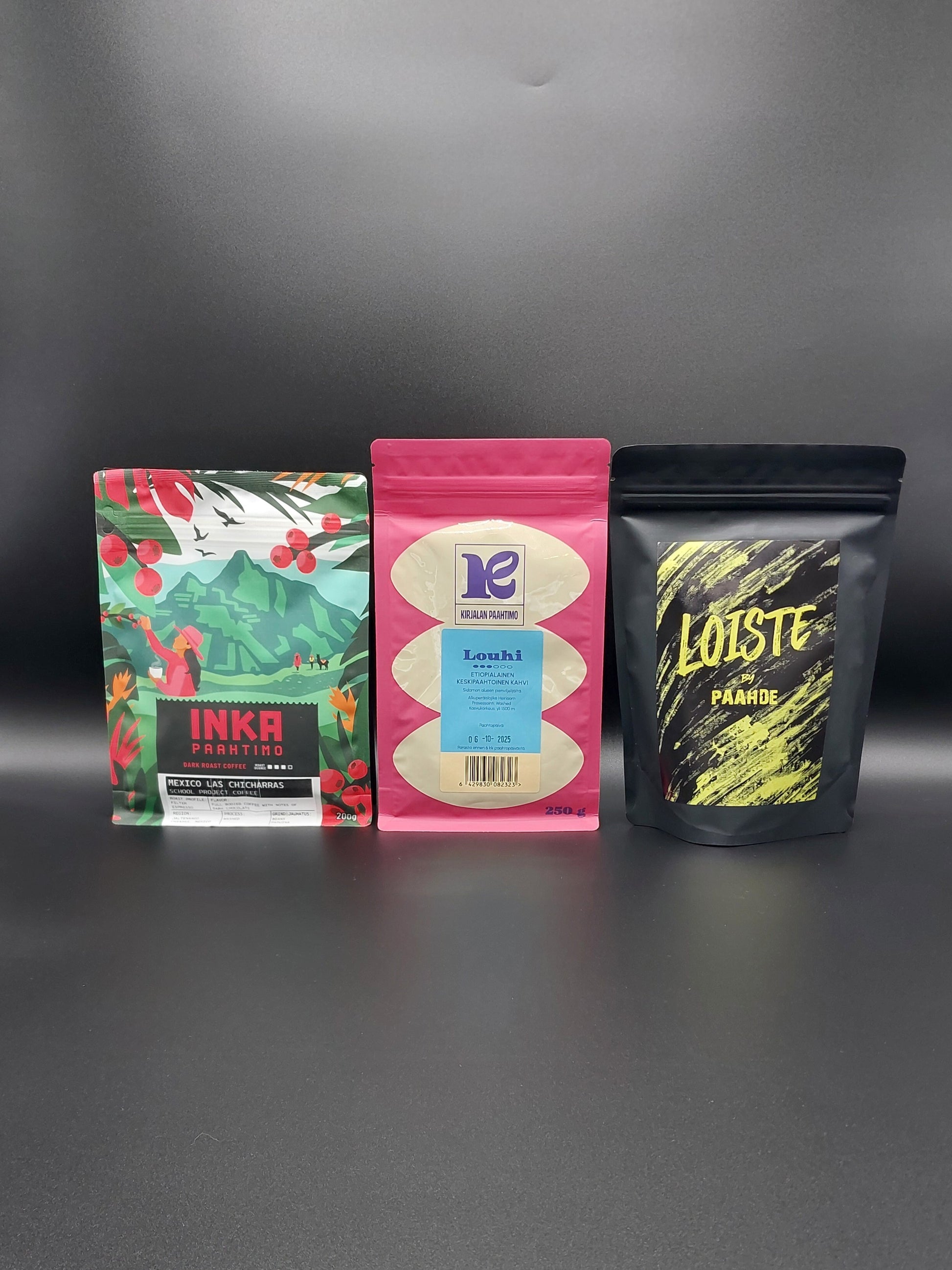 Setti sisältää nämä 3 kahvia. Voita valita kahvit suodatinjauhatuksella tai papuina.