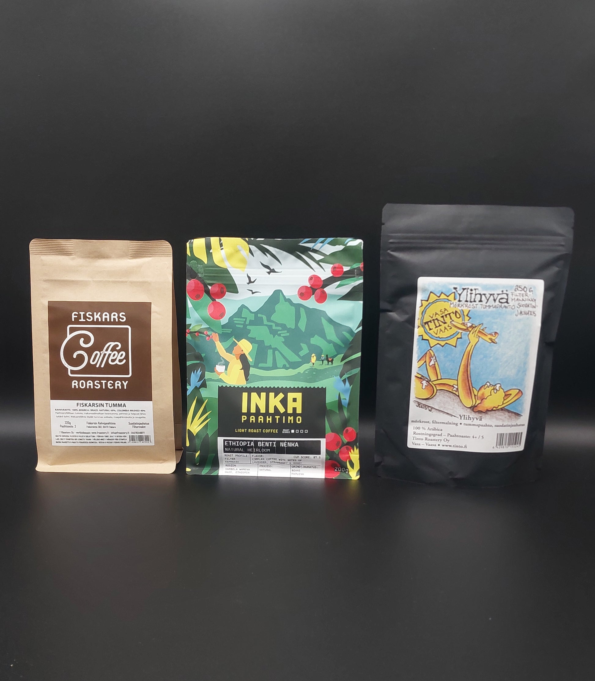 Setti sisältää nämä 3 kahvia eri paahtoasteilla. Pääset maistamaan vaalea-, keski- ja tummapaahtoiset kahvit. Voita valita kahvit suodatinjauhatuksella tai papuina.