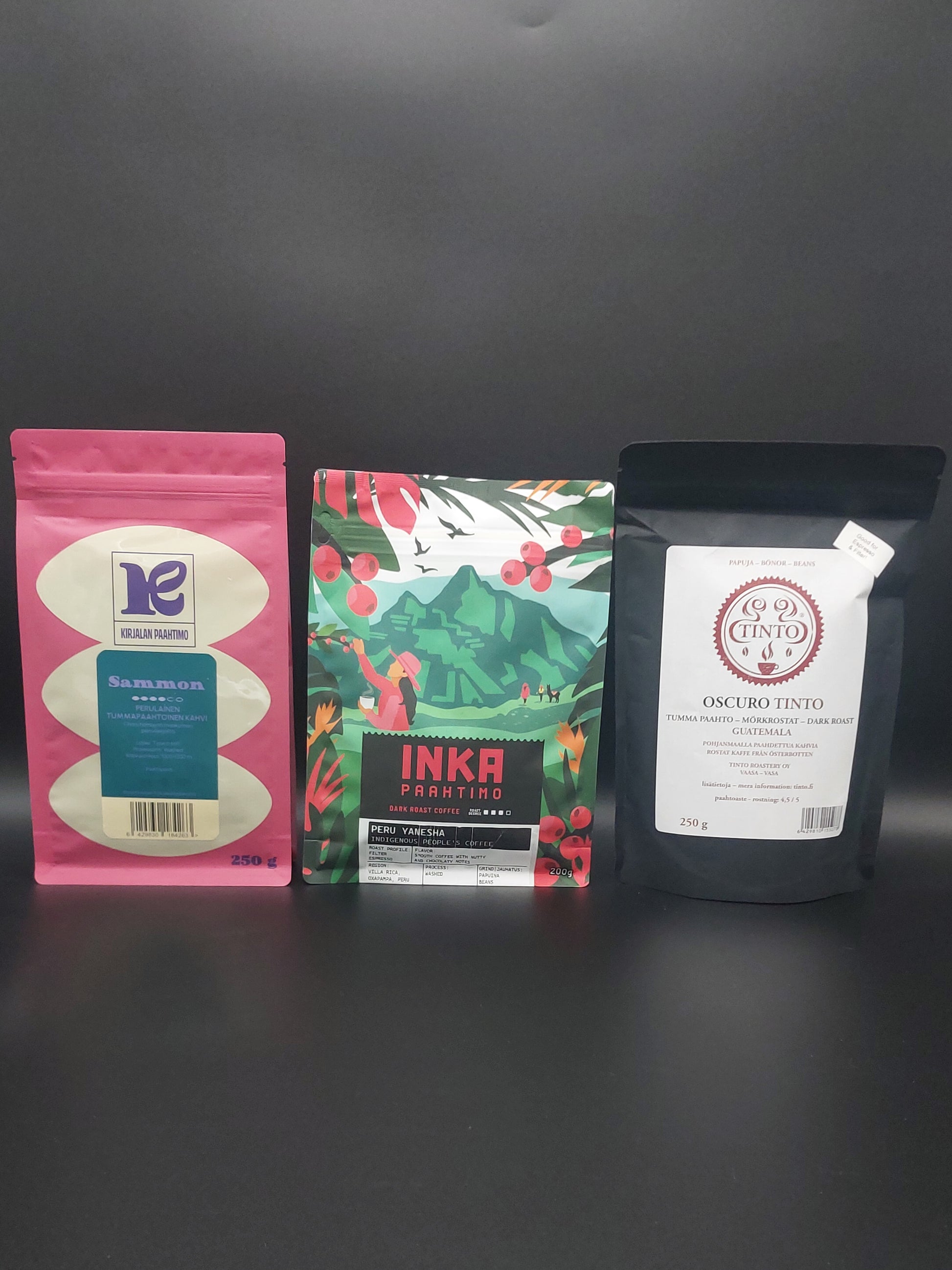 Setti sisältää nämä 3 kahvia. Voita valita kahvit suodatinjauhatuksella tai papuina.