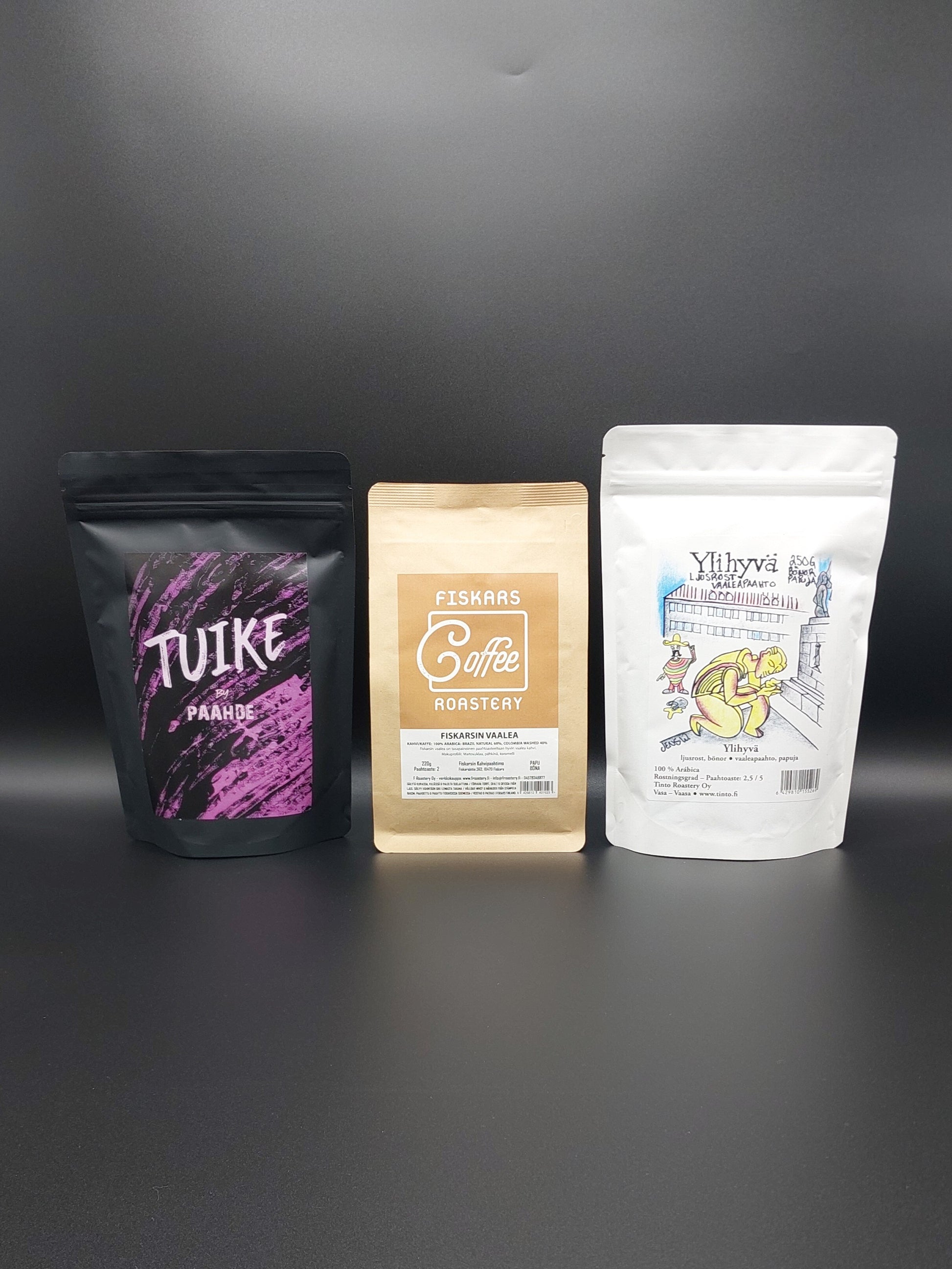 Setti sisältää nämä 3 kahvia. Voita valita kahvit suodatinjauhatuksella tai papuina.